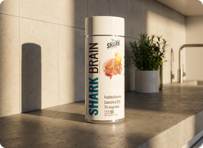 O Shark Brain é um suplemento nootrófico formulado com ingredientes premium e altamente funcionais, como NeuroSerine® (fosfatidilserina), Coenzima Q10, três formas de magnésio, além de taurina, cafeína, tirosina e vitamina B6.